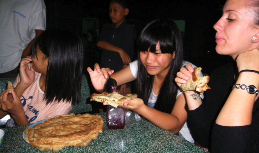 Nous nous sommes occupées à faire des crêpes que nous avons partagé avec les enfants après le repas du soir. Elles ont été plus longues à faire qu'à être mangées !